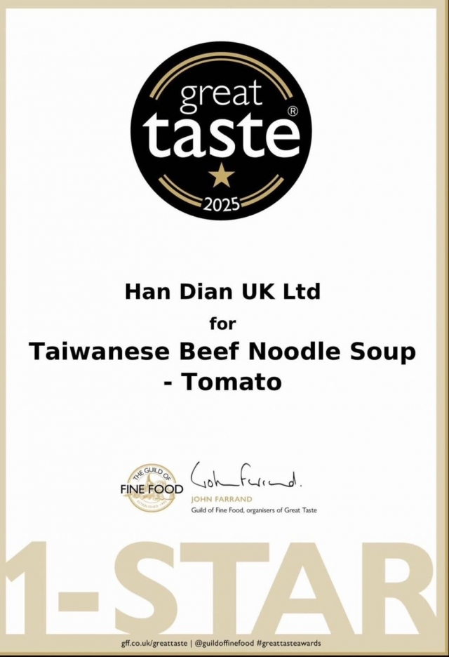 更令人驕傲的是,在2024年的巴黎國際賽師期間,漢典團隊負責供應台灣中繼站的膳食。我們用心烹調的家鄉味,成為選手們在賽場上最強大的後盾。同年,漢典食品的經典蕃茄牛肉麵更在英國榮獲被譽為食品界奧斯卡的「Great Taste Awards」星級評鑑。