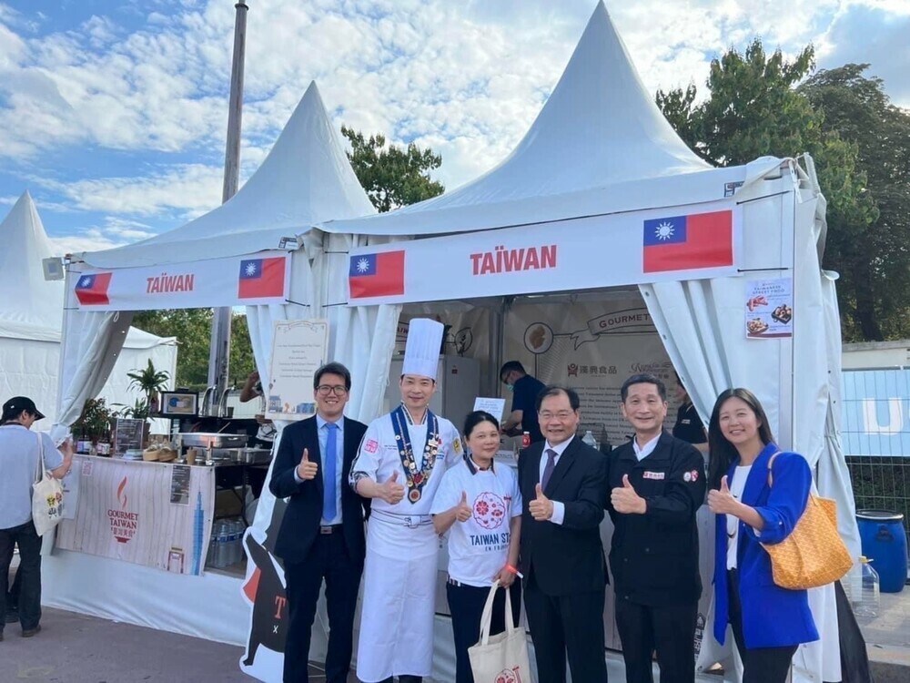 歐洲的台灣廠商向遊客推廣刈包、鹹酥雞、地瓜球、香腸等家鄉味,人潮眾多,饕客享用後對台式美食讚不絕口。