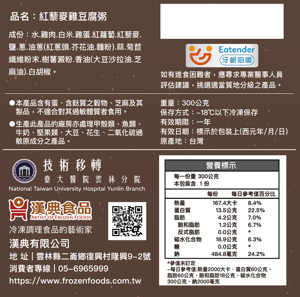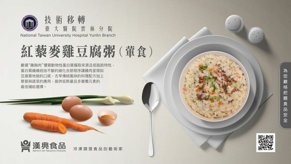 主原料“雞胸肉”是優質動物性蛋白質攝取來源且低脂肪,蛋白質纖維經由不斷的細化去筋程序讓雞肉呈現如豆腐質地般的口感,古早傳統風味的料理配方加上藜麥與蔬菜的應用,提供低熱量且多營養元素的最佳補給選擇,不單只適合銀髮族食用,也適合全年齡族因不同的需求調整各項營養的補充來源或控制,無論懷孕期間、學齡族、上班族、或健身族,都可以吃的安心、放心、及歡心,打造“全齡食”營養美學與生活態度。