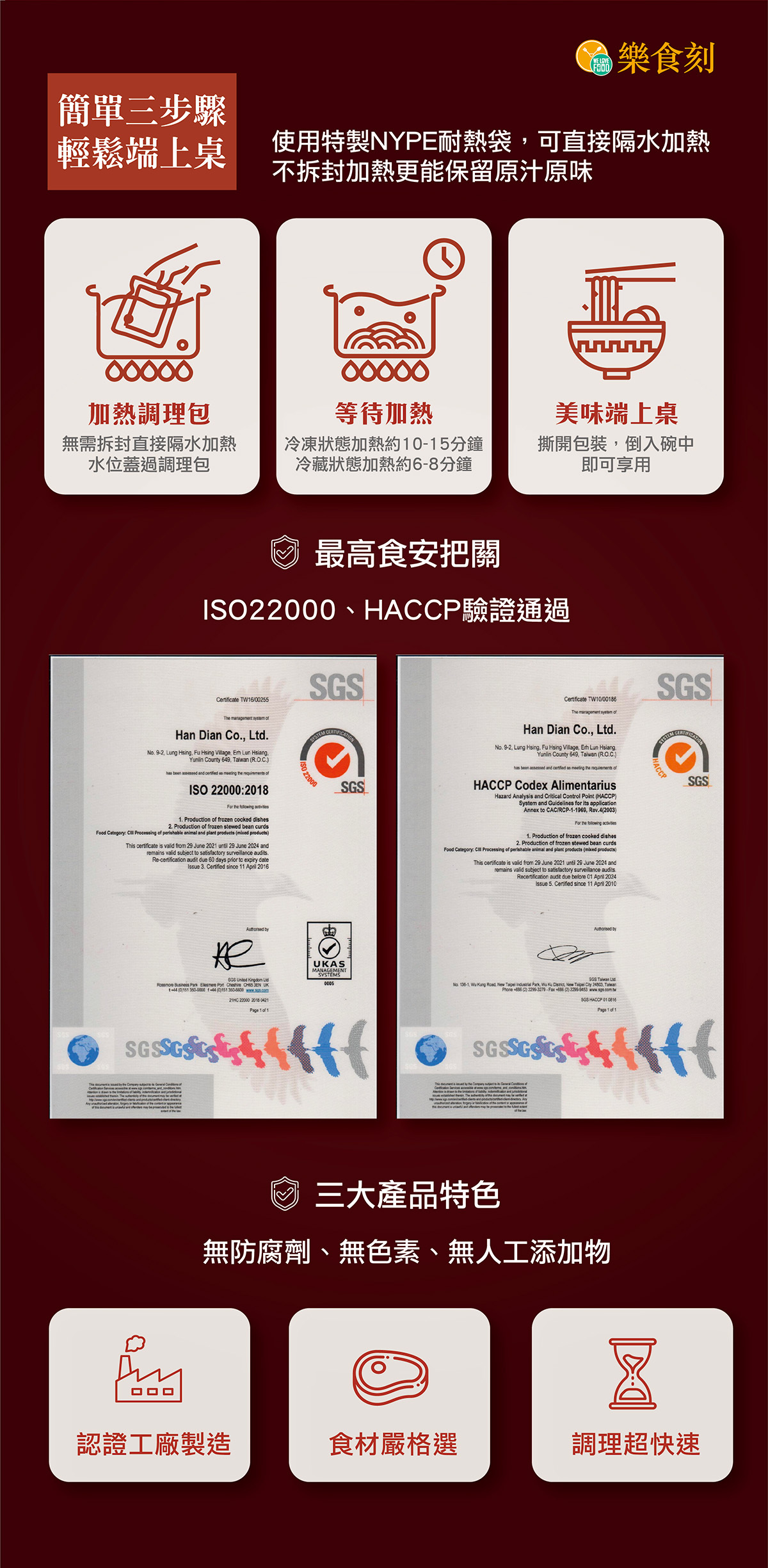 烹調方式:不解凍將料包不拆封置於水中加熱約30分鐘,倒於容器中即可食用。